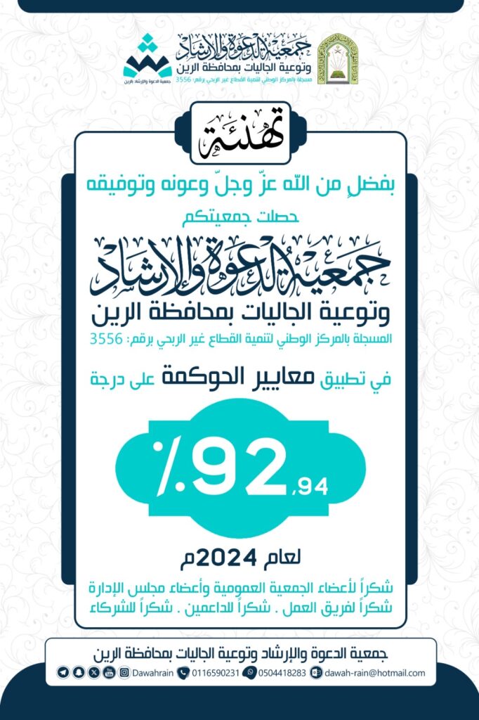 بفض الله حصلت جمعية الدعوة والإرشاد وتوعية الجاليات بمحافظة الرين في تطبيق معايير الحوكمة على درجة92.94